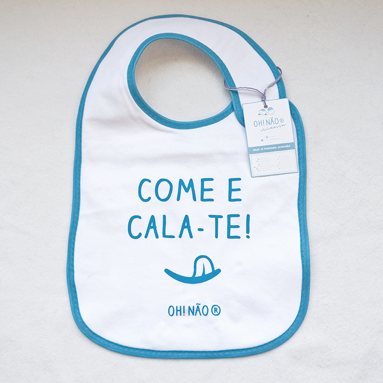 • Babete branco com bordas azuis e texto azul COME E CALA-TE! OH! NÃO ®