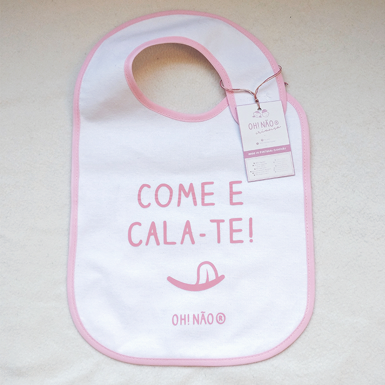 • Babete branco com borda rosa e mensagem em rosa, com etiqueta da marca OH! NÃO