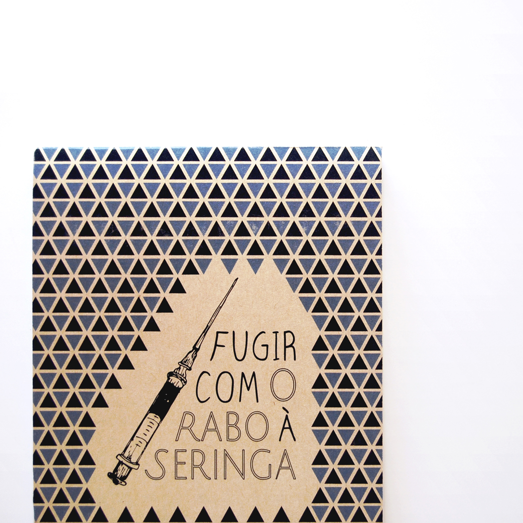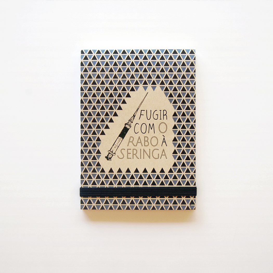 Caderno com padrão geométrico de triângulos e texto com ilustração de seringa