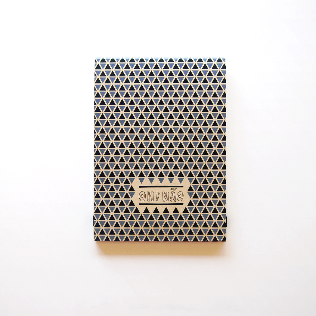 • Caderno com padrão geométrico de triângulos e texto com ilustração de seringa