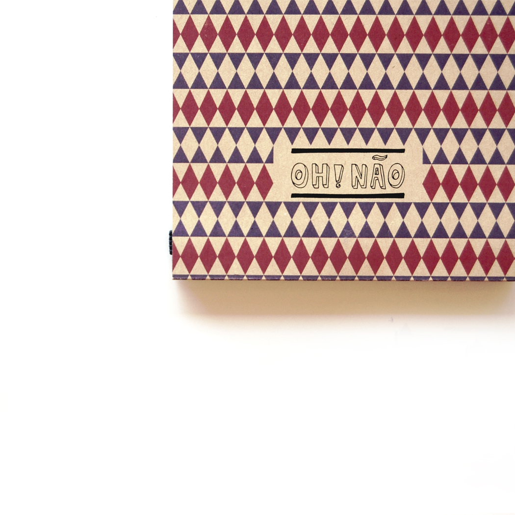 • Caixa com padrão de losangos vermelhos e azuis e etiqueta com texto OH! NÃO