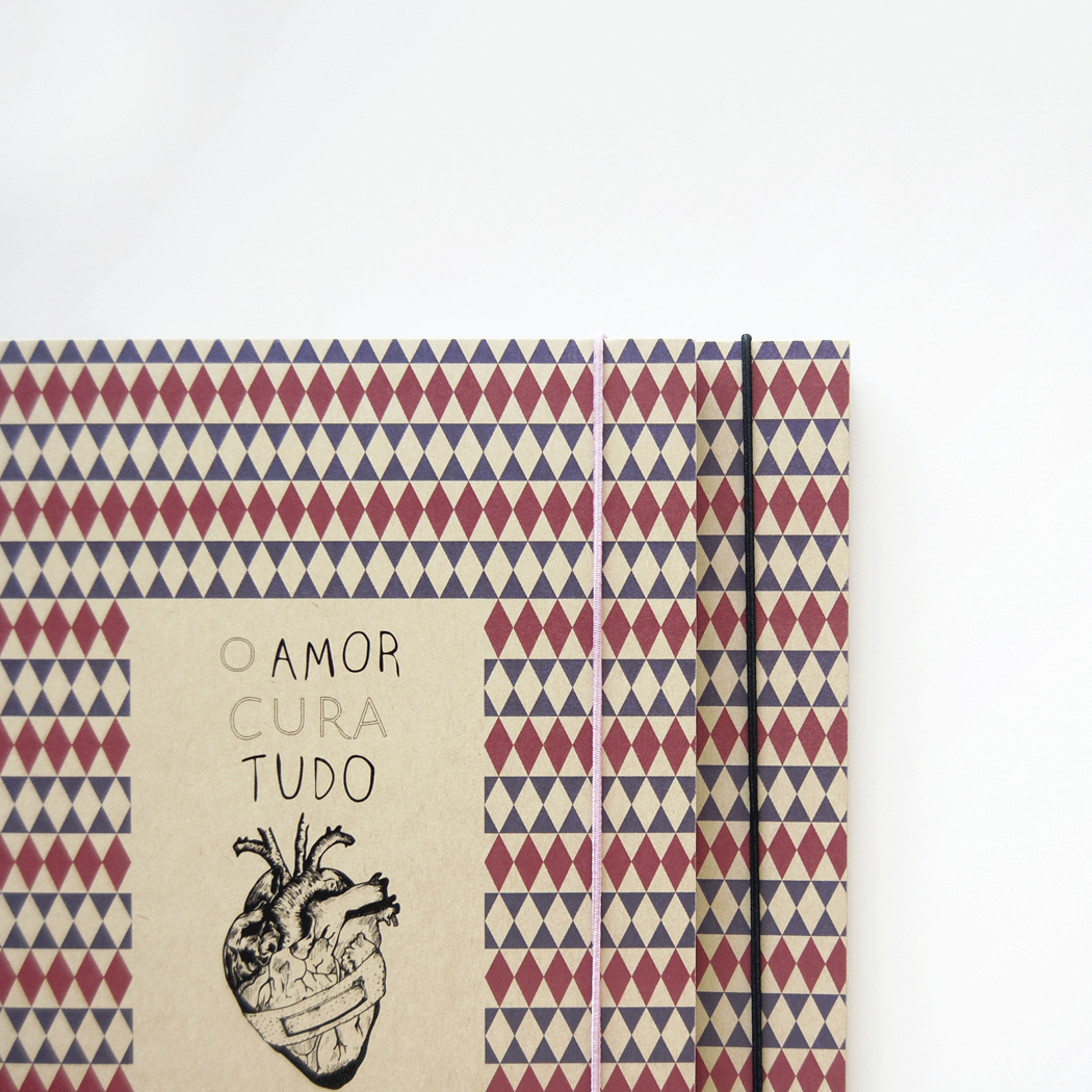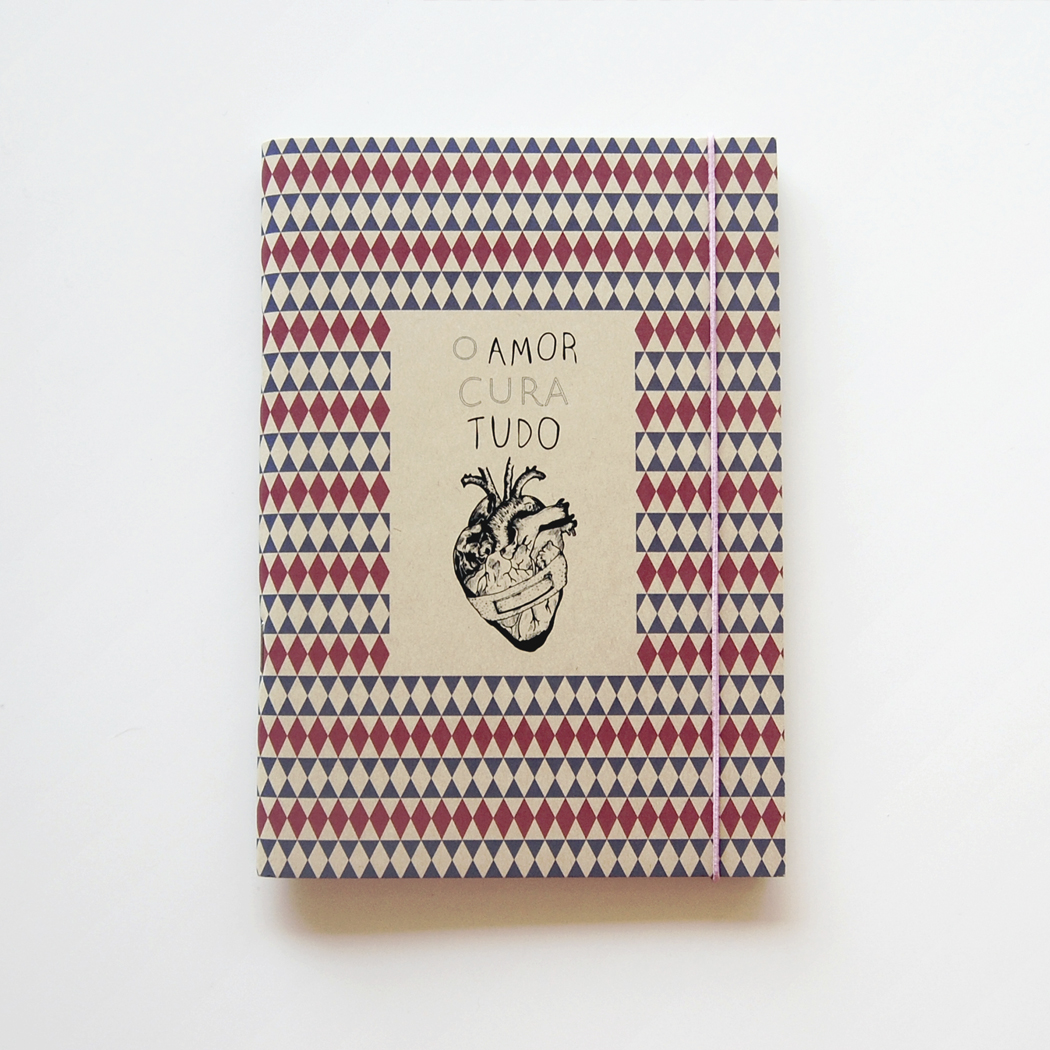• Caderno com padrão geométrico e texto 'O AMOR CURA TUDO' na capa