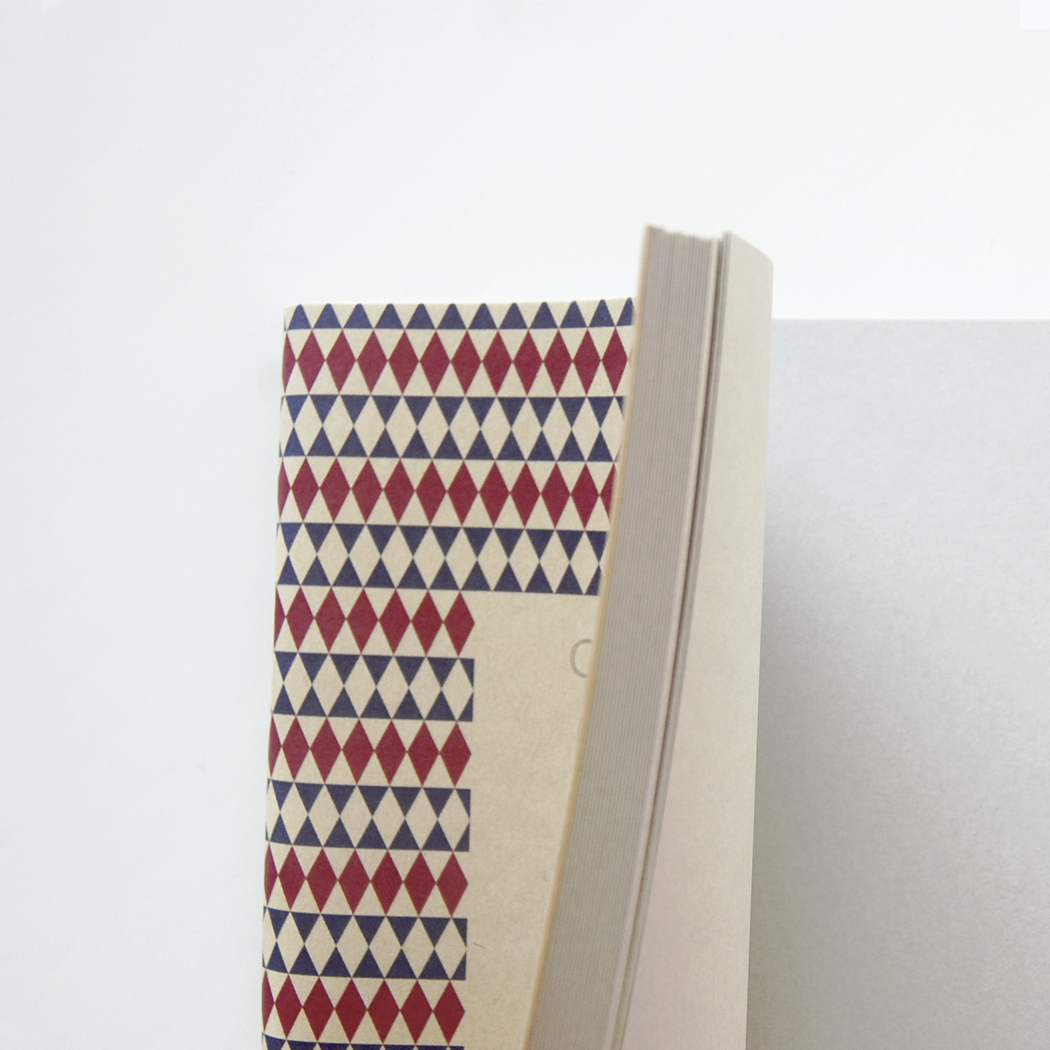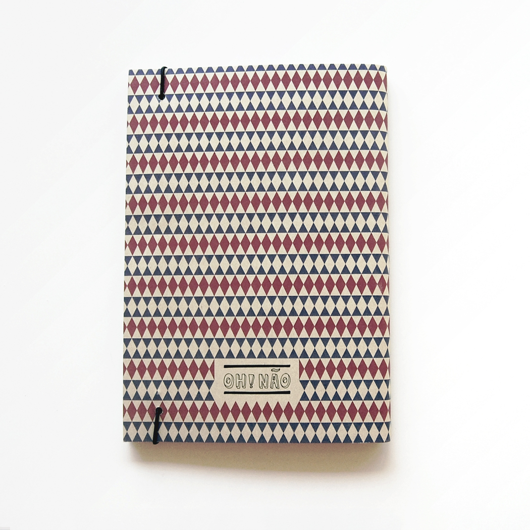• Caderno com capa em tecido estampado de losangos vermelhos e azuis com etiqueta OHUI NÃO