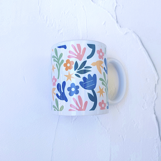 • Caneca de cerâmica branca com padrão colorido de flores e folhas