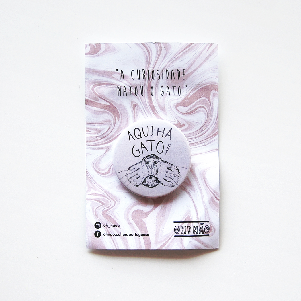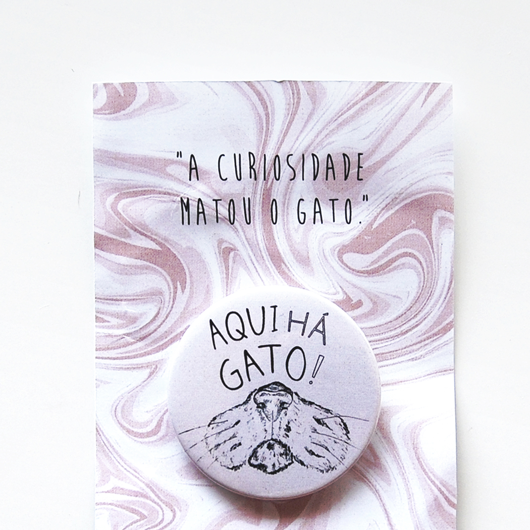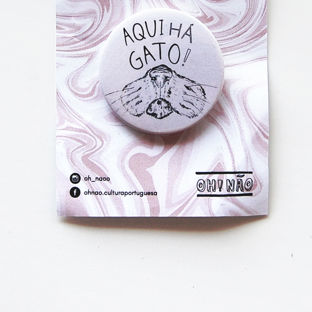 • Botão cinzento redondo com desenho de gato e texto 'AQUI HÁ GATO!' num cartão com padrão marmoreado rosa e branco
